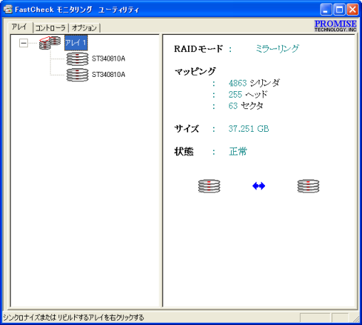 タスクトレイのアイコンをダブルクリックし、FastCheckモニタリングユーティリティ画面を表示させて、ディスクアレイの状態を確認してください。