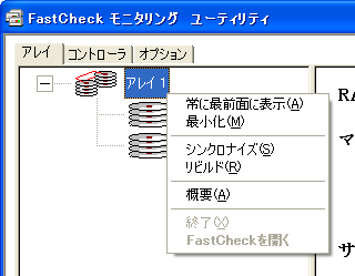 アレイ上またはドライブ上で右クリックすることで、ポップアップメニューが表示されます。ポップアップメニューにより、メンテナンス機能である「シンクロナイズ」や「リビルド」の実行や、「常に最前面に表示」や「最小化」といったFastCheckモニタリングユーティリティのウィンドウ表示の設定などが行えます。