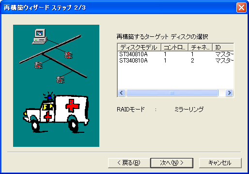 再構築ウィザードステップ2に戻るには「戻る」ボタンを、処理を中断するには「キャンセル」ボタンをクリックしてください。