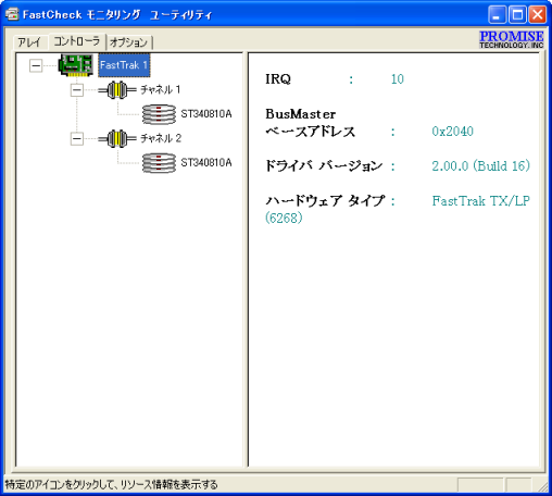 コントローラアイコン(FastTrak1)を左クリックすることによって、下記の情報が表示されます。
