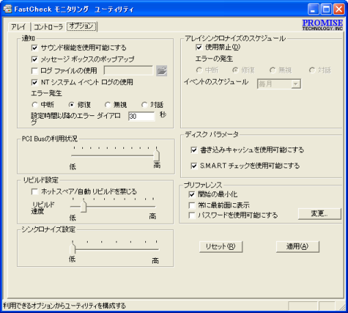 管理者は、通知、PCI Busの利用状況、リビルド設定、シンクロナイズ設定、アレイシンクロナイズのスケジュール、ディスク パラメータ、プリファレンスのそれぞれの設定をカスタマイズすることができます。