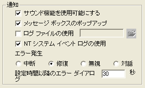 | エラー発生 | : | 問題が発生したときの対処方法を4つのラジオボタンで設定します。自動的にエラーを修復させるため、設定は「修復」のまま変更しないでください。 |