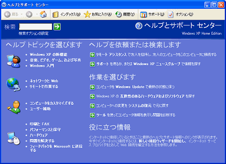 「スタート」ボタン→「ヘルプとサポート」をクリックすると、「ヘルプとサポート センター」ウィンドウが表示されます。