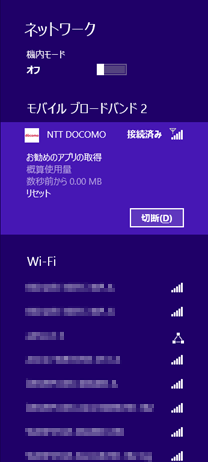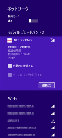 - 「モバイル ブロードバンド」に表示されているネットワーク(「NTT DOCOMO」など)をクリック