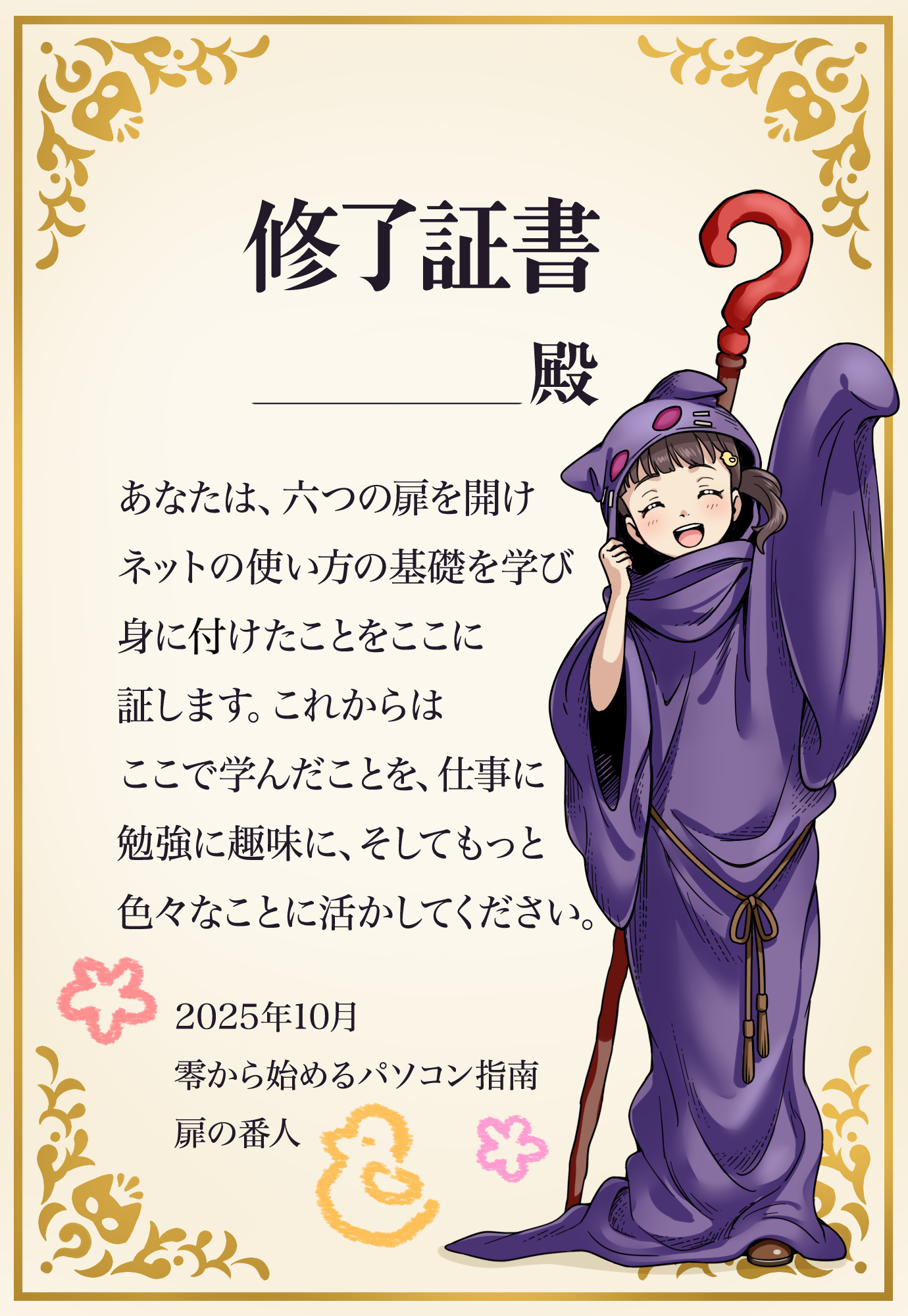 読者のみなさんも印刷して、空欄に自分の名前を書いて、修了証書にしてくださいね。