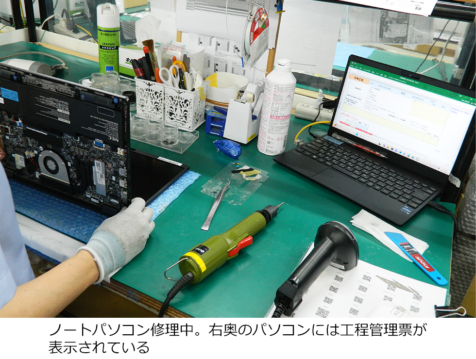 修理が終わったパソコンを修理エリアから出荷エリアに運んでいるんです。
