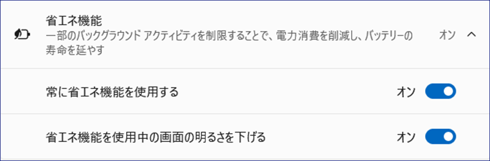 きょうは電源のないところで仕事するから、最初から電力を使わないようにしようってときは、「常に省エネ機能を使用する」をオンにしておくといいんだにゃ。