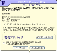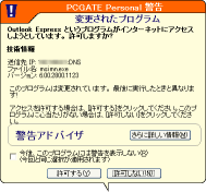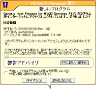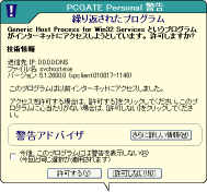 プログラムがネットワークにアクセスする際に、PCGATE Personalが次のようなポップアップ警告を表示することがあります。表示された内容を確認して「許可する」または「許可しない」をクリックしてください。 ・より詳しい内容を見たい場合、それぞれの画面で「さらに詳しい情報」をクリックすると、インターネットに接続され、「許可する」「許可しない」の判断に役立つ情報が表示されます。