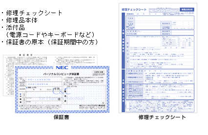 お引き渡しの際には、故障品とともに修理チェックシートや保証書などをご用意ください。