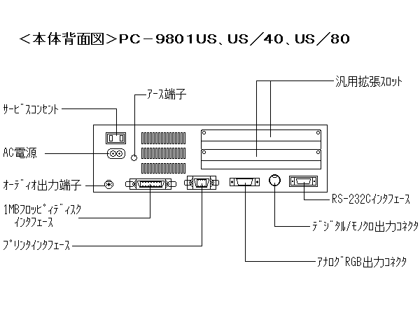型 名 :PC-9801US 価 格 :248000 発表日 :92/07 出荷日 :92/07 CPUクロック : i386SX(16MHz)V308MHz相当 ROM : BIOS及びN88-BASIC(86)96KB 標準RAM : 1.6MB 最大ユーザーズメモリ : 14.6MB グラフィックVRAM容量 : 256KB グラフィックVRAM画素数: 640*400 グラフィックVRAM色数 : 4096色中16色2画面 サウンドVRAM : テキストVRAM : 12KB 拡張スロット数 : 2 拡張スロット電源容量 + 5V :0.8A +12V :0.06A -12V :0.07A 標準実装ドライブ FDD :3.5インチ(1MB/640KB)*2 内蔵インタフェースコネクタ:1MFDDI/F プリンタI/F マウスI/F :RS-232CI/F アナログCRTI/F デジタルB/WI/F 漢字 :標準:第一、第二、拡張 サウンド機能 :標準実装 カレンダ時計 :μPD4990A VCCI適合 :2種OdB 使用条件 電圧 :AC100V±10% 周波数:50/60 温度 :10-35 湿度 :20-80(結露なし) 消費電力 標準 (W) :26 最大 (W) :52 エネルギー消費効率 (W) :26 外形寸法 本 体 (mm) (W):305 (D):240 (H):87 キーボード(mm) (W):435 (D):180 (H):34 重量 本体 (Kg) :4.5 キーボード(Kg) :1.2 添付品:*キーボード*電源ケーブル :*保証書*お客様登録カード :*98トレーニングディスク*N88-BASIC(86)ガイド ■商品情報3(外観図)