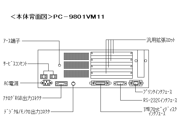 型 名 :PC-9801VM11 価 格 :328000 発表日 :88/11 出荷日 :88/11 CPUクロック : V308/10MHz切り替え(メモリアクセス0WAIT) ROM : N88-BASIC(86)及びモニタ96KB 標準RAM : 648KB 最大ユーザーズメモリ : 640KB グラフィックVRAM容量 : 256KB グラフィックVRAM画素数: 640*400 グラフィックVRAM色数 : 4096色中16色2画面 サウンドVRAM : テキストVRAM : 12KB 拡張スロット数 : 4 拡張スロット電源容量 + 5V :0.8A +12V :0.06A -12V :0.07A 標準実装ドライブ FDD :5インチ1M/640KFDD2-DRIVE 内蔵インタフェースコネクタ:1MFDDI/F プリンタI/F RS-232CI/F :マウスI/F B/W・デジタルCRT両用I/F アナログCRTI/F 漢字 :標準:第一、第二オプション:拡張 サウンド機能 :オプション カレンダ時計 :μPD4900使用年サポートあり VCCI適合 :基準レベル0 使用条件 電圧 :AC100V±10% 周波数:50/60 温度 :10〜35 湿度 :20〜80%(結露なし) 消費電力 標準 (W) :35 最大 (W) :110 エネルギー消費効率 (W) :35 外形寸法 本 体 (mm) (W):380 (D):335 (H):150 キーボード(mm) (W):435 (D):180 (H):34 重量 本体 (Kg) :9.3 キーボード(Kg) :1.2 添付品:*キーボード*電源ケーブル*アース線 :*保証書*お客様登録カード*ケーブルラベル :*サービス網一覧表*グリーティングカード*ケーブルカバー :*FD4枚:N88-日本語BASIC(86)(Ver6.0)システムディスク・辞書(1)・辞書(2) : PCトレーニングディスク :*マニュアル5冊:(備考参照) 備考 :*増設用3.5インチ固定ディスクの内蔵可能。 :*マニュアル5冊: :N88-日本語BASIC(86)(Ver6.0)関連:ユーザーズマニュアル・リファレンスマニュアル・BASIC入門 :その他:ガイドブック・ハードウェアマニュアル ■商品情報3(外観図)